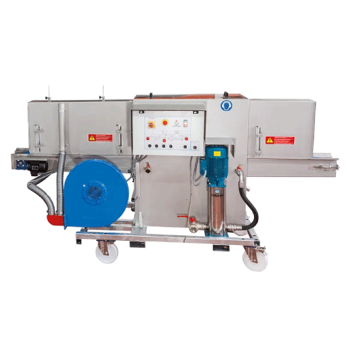 - Adecuado para el lavado y el enjuague de las bandejas que se transportan en posición vertical sobre una correa.